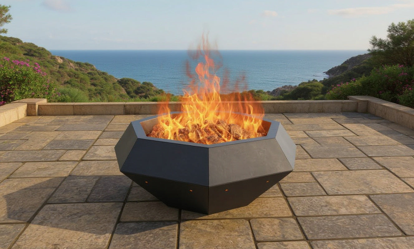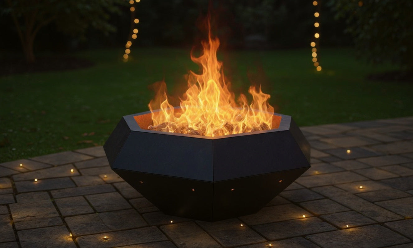 Refined geometry meets elemental brilliance in the Astra firepit — a sculptural form inspired by the precision of cut stone and the radiance of fire. Its multi-faceted steel body widens from a stable base into a perfect, balanced bowl, capturing light and shadow in equal measure.