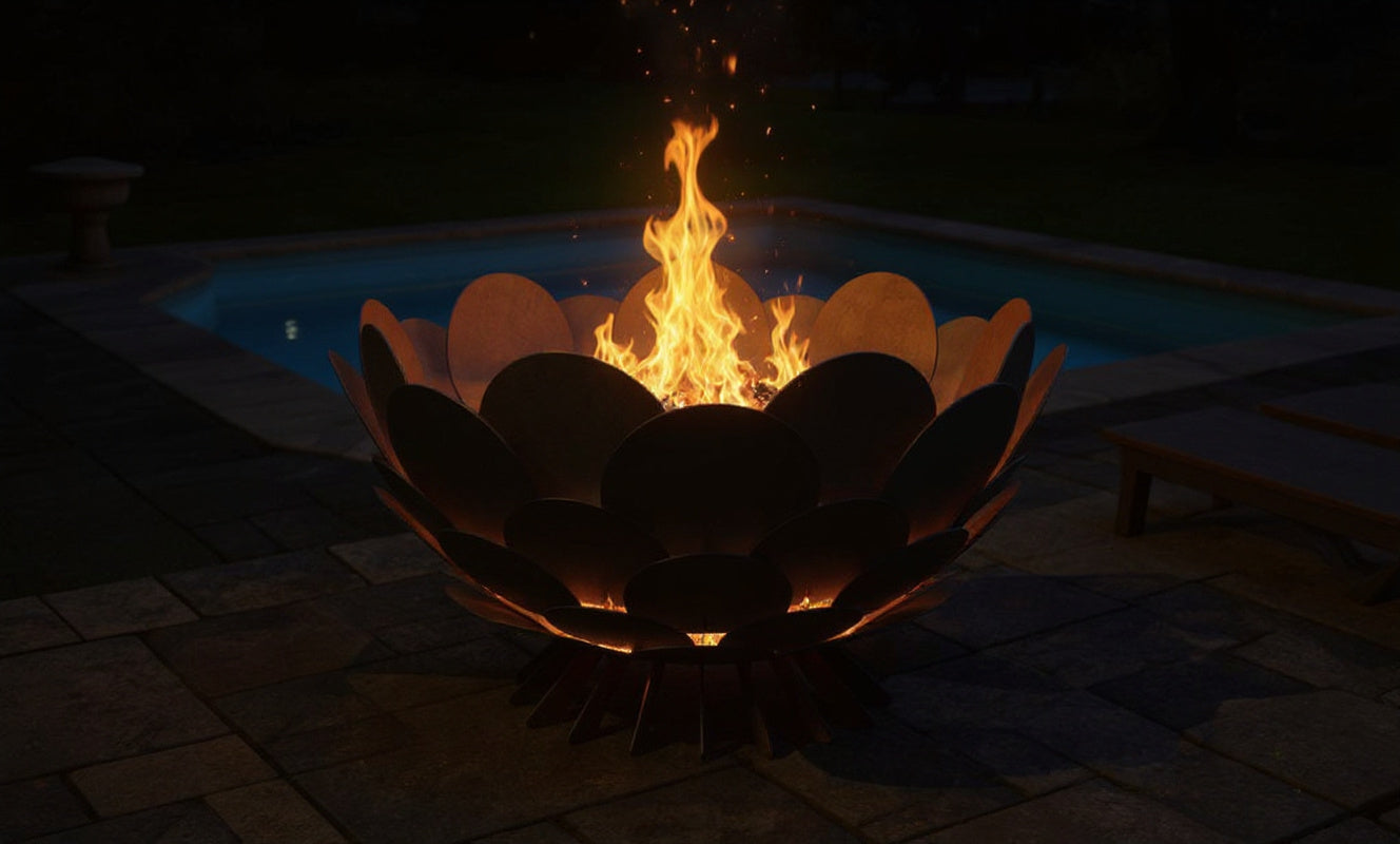 With its bold, sculptural silhouette, The Ember Bloom evokes the strength and symmetry of nature’s design. Layered steel panels rise in elegant formation, surrounding the flame in a pattern reminiscent of leaves or petals unfurling at dusk. The result is a striking blend of organic inspiration and contemporary craftsmanship.