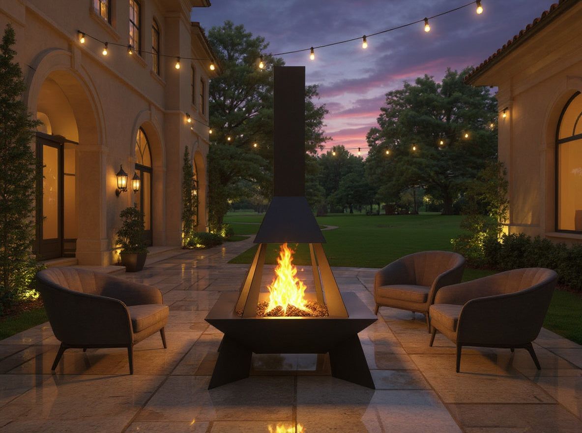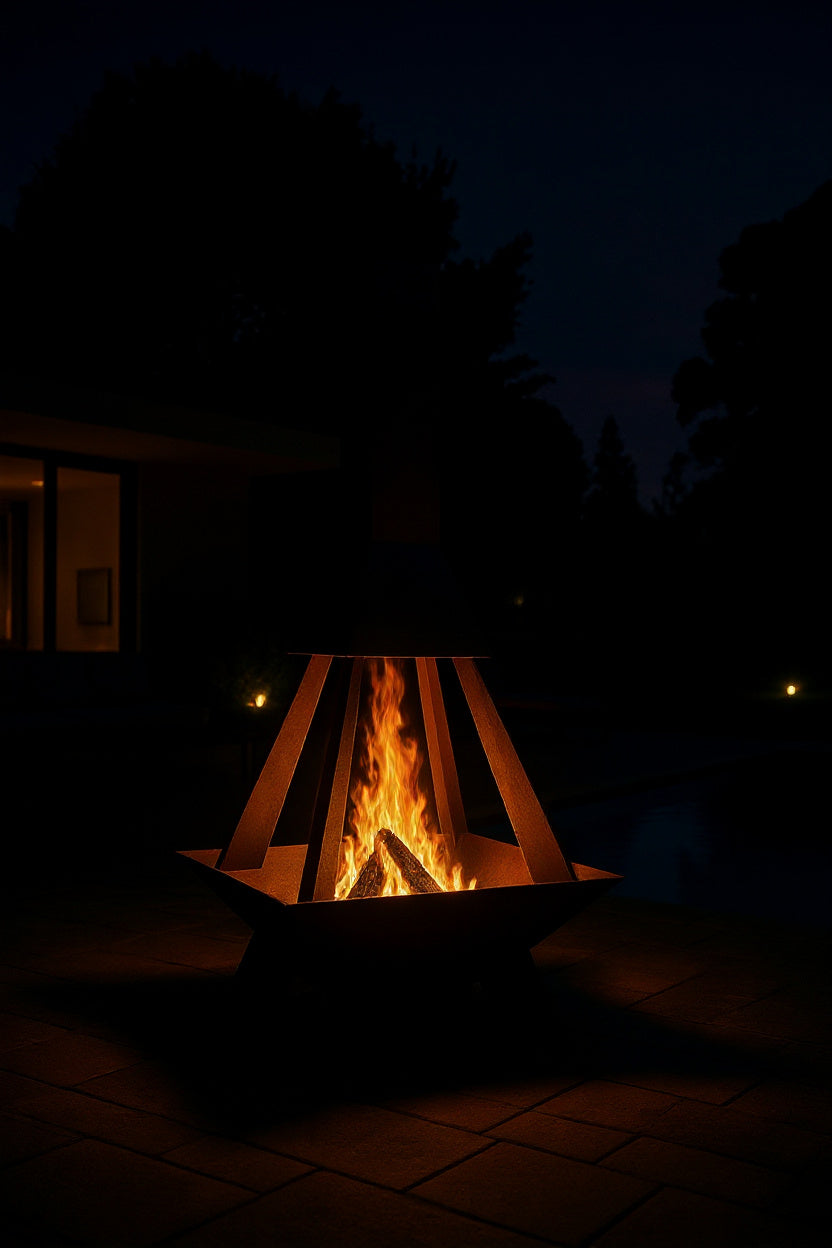 A bold, angular ember tower forged in matte black steel, with slanted sides, vertical supports, and a tall chimney that channels smoke cleanly upward. Its polygonal fire mouth and geometric silhouette create a commanding presence, blending sculptural form with elemental function. Designed to anchor outdoor spaces with architectural clarity and enduring warmth.