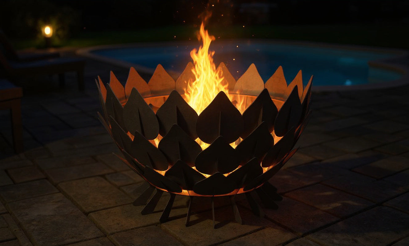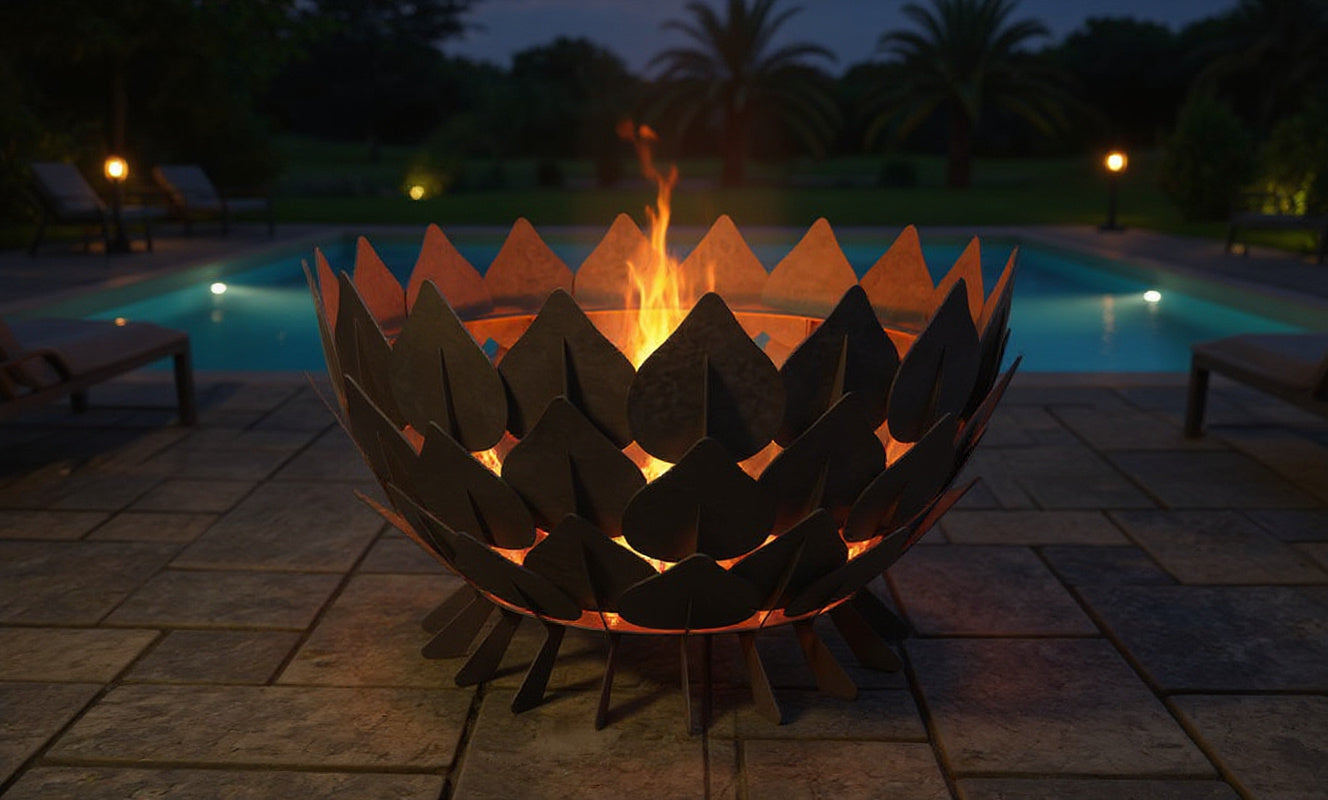 Graceful and poised, The Lotus fire pit unfolds like a flower in bloom — its curved panels forming a symmetrical basin that cradles the flame with effortless elegance. Each contour is precision-cut and hand-assembled from heavy-gauge steel or weathered Corten, creating a sculptural piece that is as timeless as it is functional.