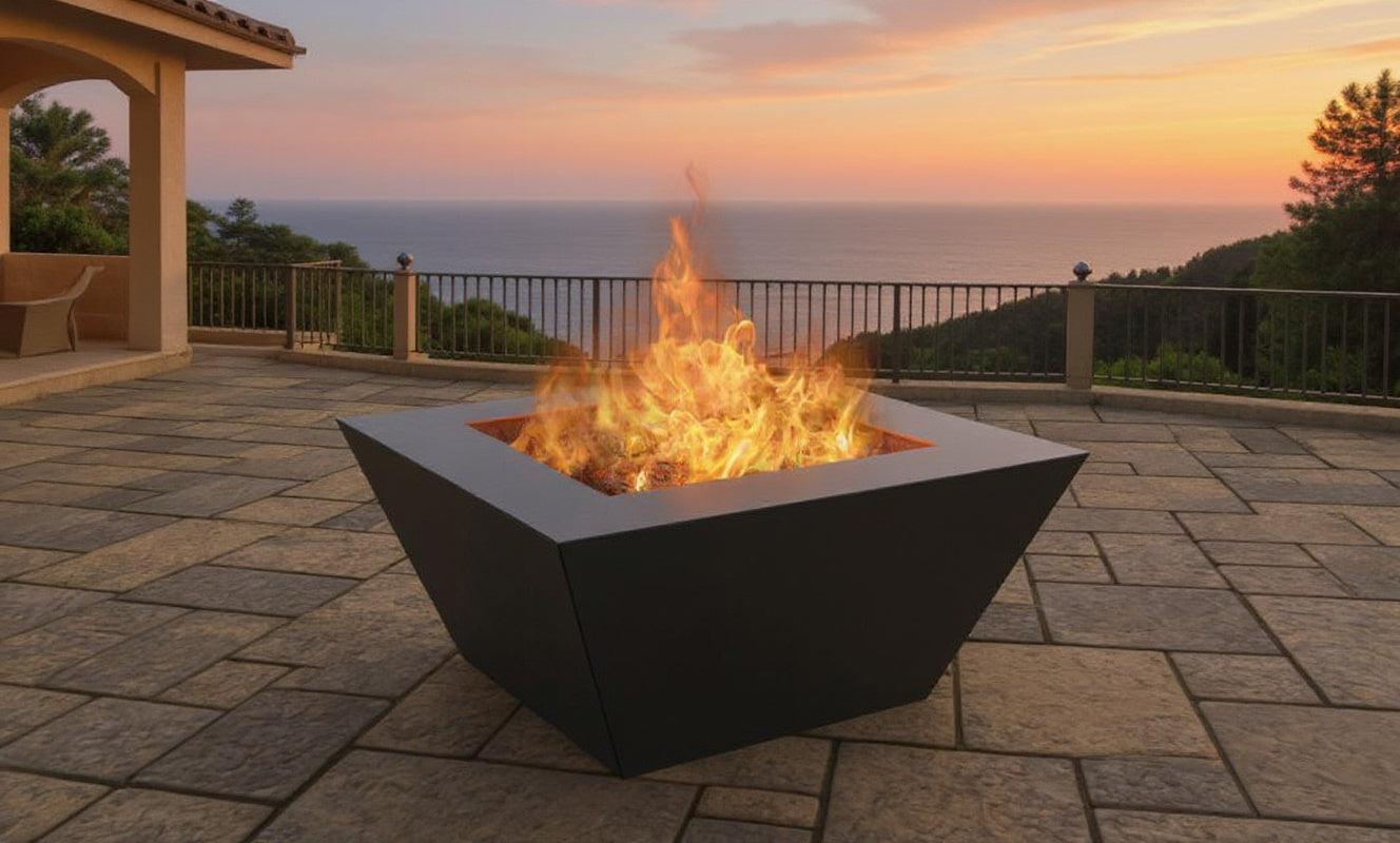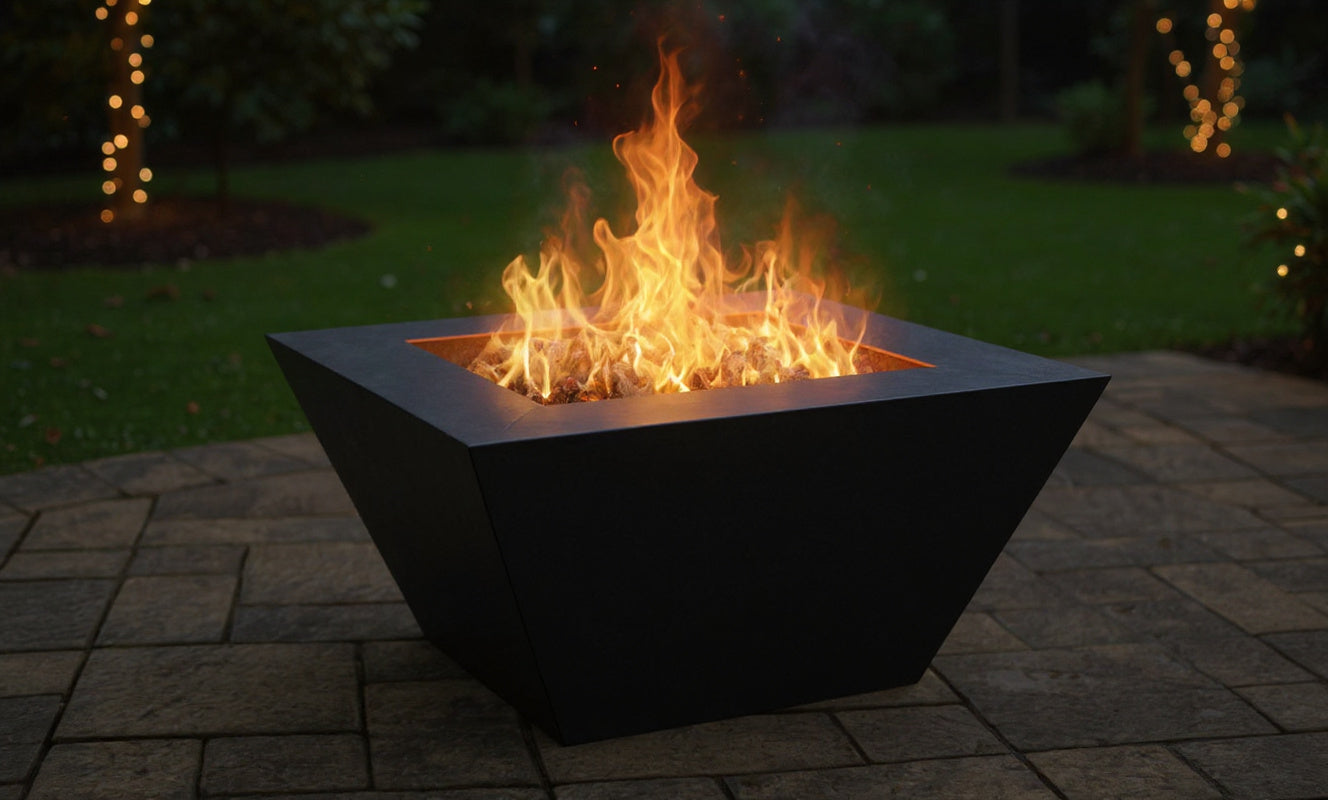 Sculpted simplicity with commanding presence. The Onyx fire pit draws inspiration from the purity of geometric form — four sweeping sides rise and flare outward, culminating in a bold, solid rim that defines its silhouette. The result is a piece that feels both grounded and elevated — a monolith of fire and form.